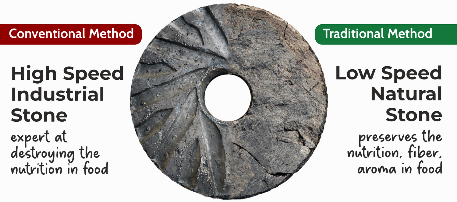 Natural Stones stay cooler, and help retain natural aroma and nutrients. Pure traditional gentle grinding.