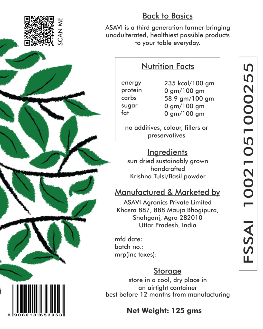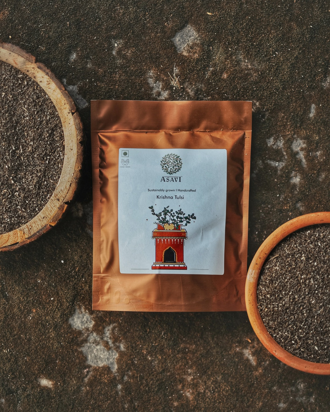 Krishna Tulsi (a shrub from the Basil family), is massively grown in Western Uttar Pradesh. This product is handcrafted and filtered naturally. No machines are involved in the entire production process. It is 100% natural product with no color, additive or preservatives.